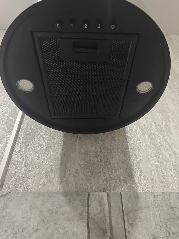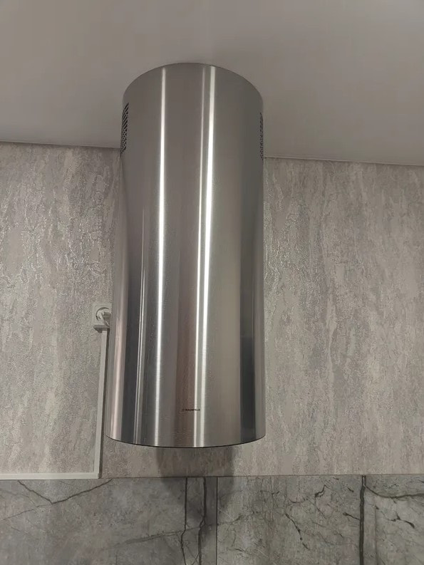 Корпус цилиндрической формы, выполненный из нержавеющей стали с термостойким покрытием черного цвета, устанавливается на стену над поверхностью плиты. Алюминиевый многослойный жироулавливающий фильтр находится в нижнем торце вытяжки.