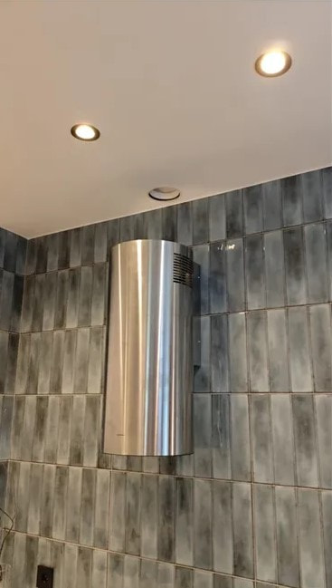 Пристенная дизайнерская вытяжка DRUM Wall 35 выполнена в современном стиле. Модель имеет строгую цилиндрическую форму. Вытяжка притягивает взгляд и гармонично вписывается в интерьер кухни.