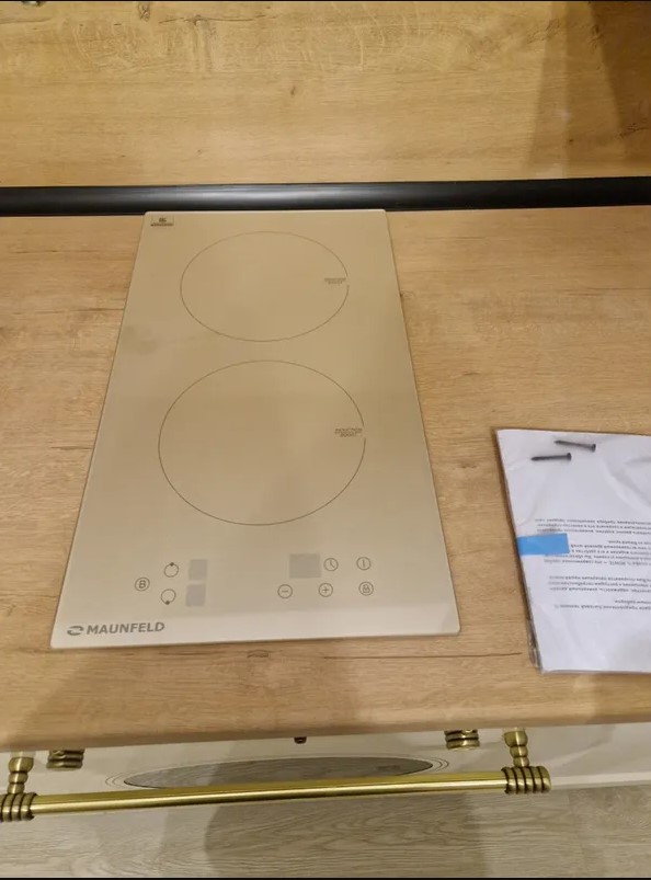 Индукционная варочная панель бежевого цвета шириной 30 см. Выполнена из жаропрочного износостойкого стекла (