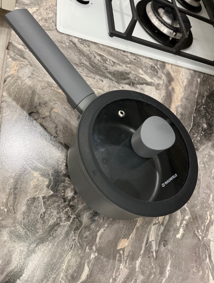 Ковш идет в комплектации со стеклянной жаропрочной крышкой. Бакелитовая ручка