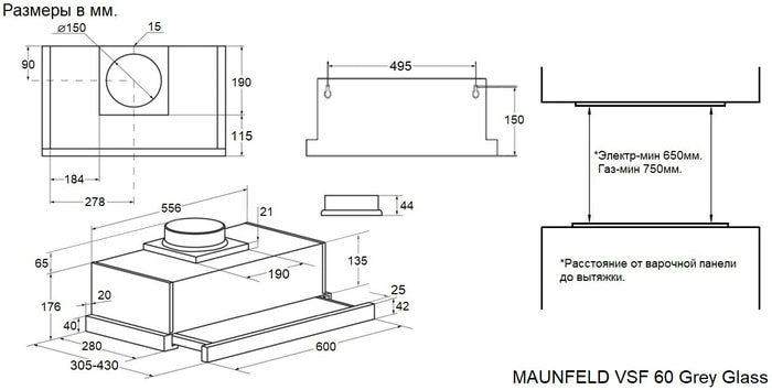 Установка: Встраиваемая. Монтируется в стандартный шкаф шириной 600 мм. Габариты корпуса (ШхВхГ): 600 x 197 x 305 мм.
